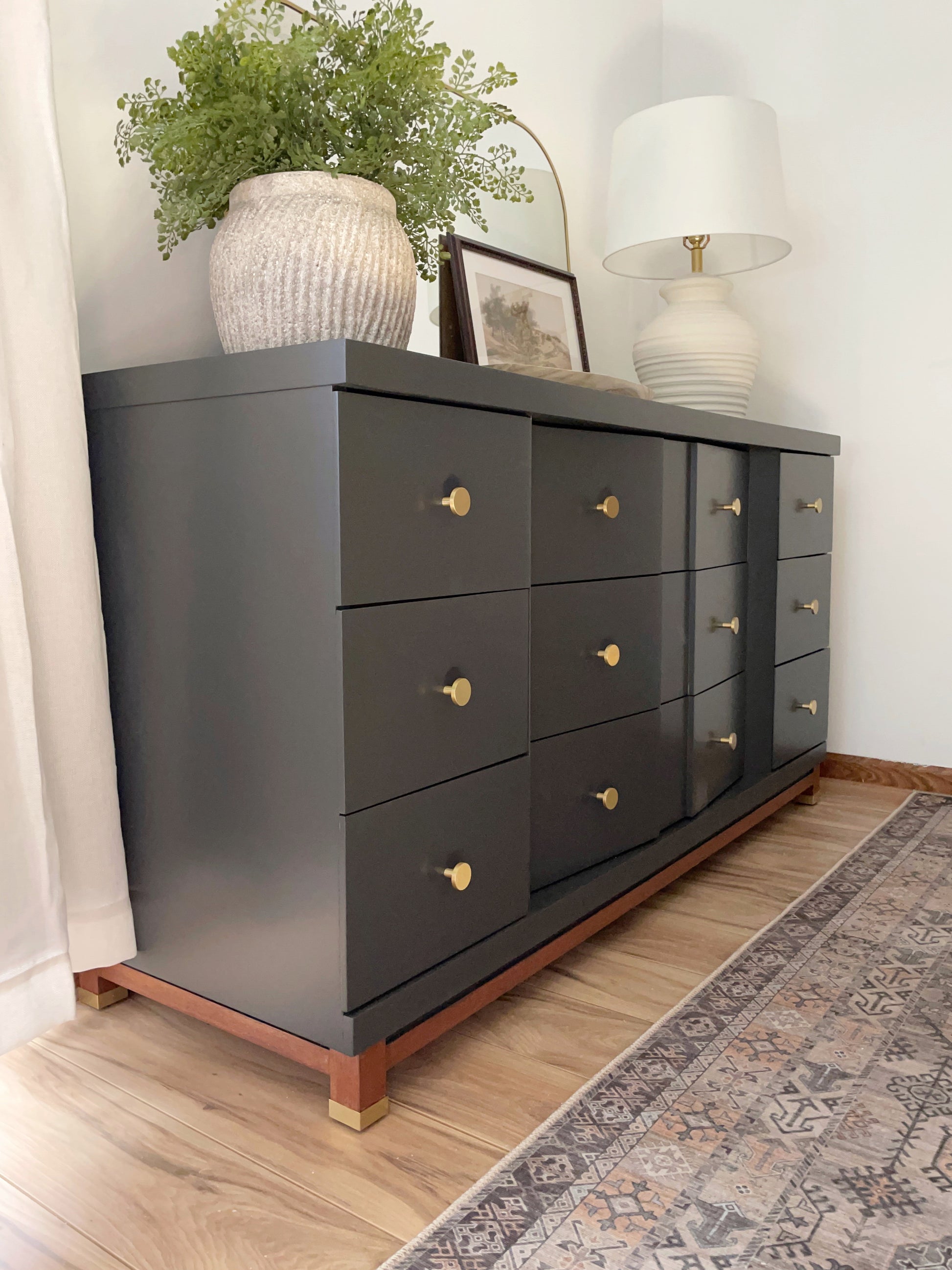 Make a bold and elegant statement with this professionally refinished vintage Basic-Witz dresser set. Painted in Blacktop by Benjamin Moore — a rich, deep black that brings sophistication and warmth to any space — these heirloom-quality pieces combine classic mid-century design with a modern update.